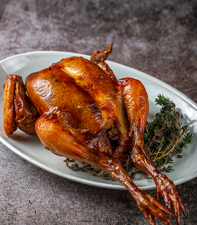 Elevate the chicken to new heights of flavor and succulence by immersing it in a tantalizing brine infused with aromatic herbs and zesty lemon. Chef's precision skill delicately weaves the seasoned rice stuffing into the crevices between the luscious skin and succulent flesh of the chicken. Allow the chicken's skin to gracefully air dry, embracing a process that primes it for an irresistible crispness.